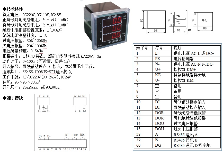 CAKJ-96DCJ絕緣監(jiān)察裝置,適用于DC300V以下直流不接地系統(tǒng)絕緣監(jiān)測(cè)。通過(guò)橋式比較電路及乒乓輔助判斷電路,準(zhǔn)確計(jì)算出直流母線(xiàn)正負(fù)極對(duì)地絕緣電阻(單母線(xiàn)絕緣降低或雙母線(xiàn)平衡絕緣降低),并給出不同信號(hào),為直流系統(tǒng)故障分析提供依據(jù)。