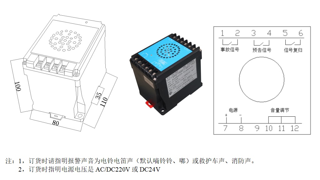 CAKJ-DDLF語音報警器,是為電力系統(tǒng)中央信號報警而設(shè)計的一款低功耗、無干擾、大音量電子式報警設(shè)備。采用單片機模擬電磁式電鈴電笛聲音頻譜,其發(fā)聲與電磁式電鈴電笛發(fā)聲相似度達98%。且具備報警信號保持及遠程復(fù)歸功能。